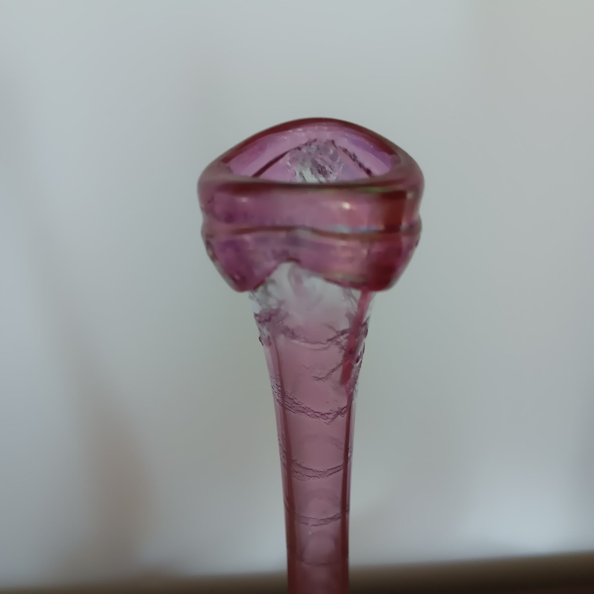 A rare piece by renowned German glass artist Heiner Düsterhaus. This handblown vase features an elongated neck, an organically folded base, and subtle iridescent pink hues that shift with the light.