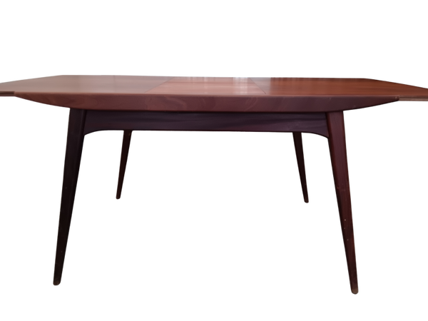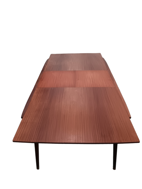 Elegant mid-century modern extendable dining table designed by Louis van Teeffelen for Wébé in the 1960s. This sought-after “Milano” model features an organic, sculptural silhouette with softly rounded corners, slender tapered legs, and a smooth extension mechanism that allows the table to expand seamlessly for extra guests.