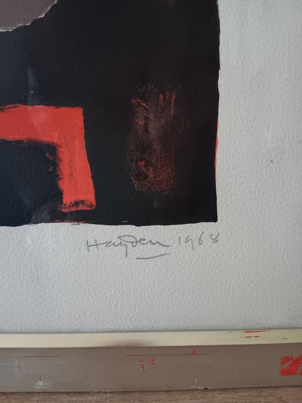 Executed in a bold abstract style, the work features a dynamic interplay of red, black, and grey tones, characteristic of Hayden’s late period. The composition reflects both his early Cubist influences and his transition toward a more expressive, modernist language.