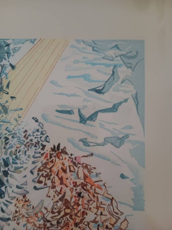 The composition is alive with movement: dynamic figures dissolve into flowing patterns of color, while rays of light and soaring birds evoke the divine act of bringing life into existence. Dalí’s painterly approach to the lithograph medium captures both mystical spirituality and modern abstraction.