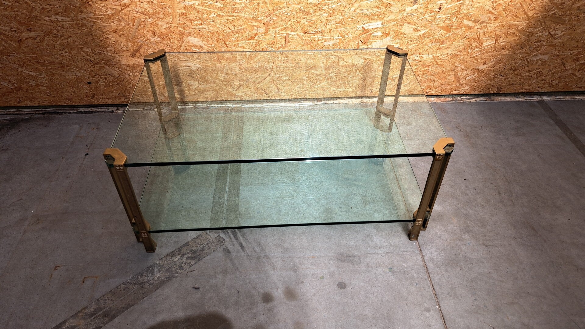 Elegant vintage Peter Ghyczy coffee table with solid bronze legs and double glass shelving. The table features thick 1.5 cm glass plates on both the top and bottom, giving it a refined yet robust presence. A true statement piece with timeless modernist design and impressive weight and quality.