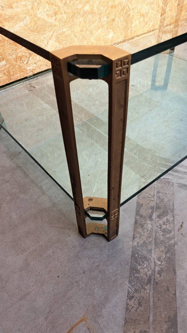 This impressive vintage coffee table by renowned designer Peter Ghyczy is a true statement piece for any modern interior. The table features a solid bronze frame with sculptural legs, combined with two substantial glass plates – both 1.5 cm thick – creating a bold yet refined aesthetic. With its double glass shelving, this model offers both elegance and practicality, making it ideal as a centerpiece in a living room, lounge, or design collection.