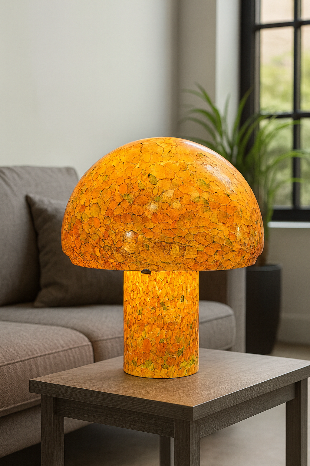 Rare vintage Peill & Putzler mushroom lamp from the 1970s. This large model measures 47 cm in height with a 37 cm diameter and is crafted from hand-blown mottled orange glass. Both the shade and base are made of glass, creating a seamless sculptural form that radiates a warm, atmospheric glow.