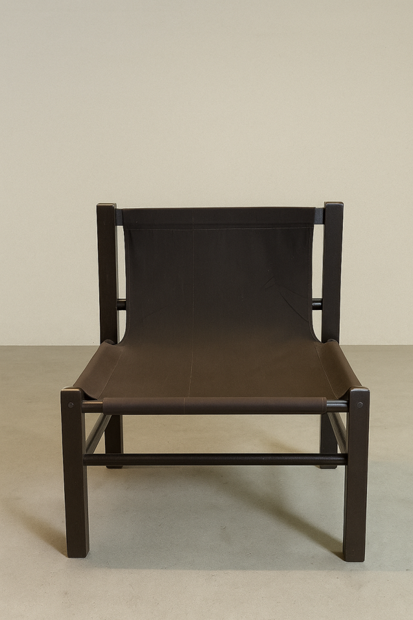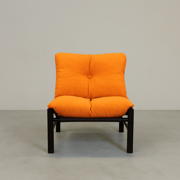The design combines a black-stained solid ash frame with a floating canvas sling seat and removable orange linen cushions, creating a striking balance between structure and comfort.