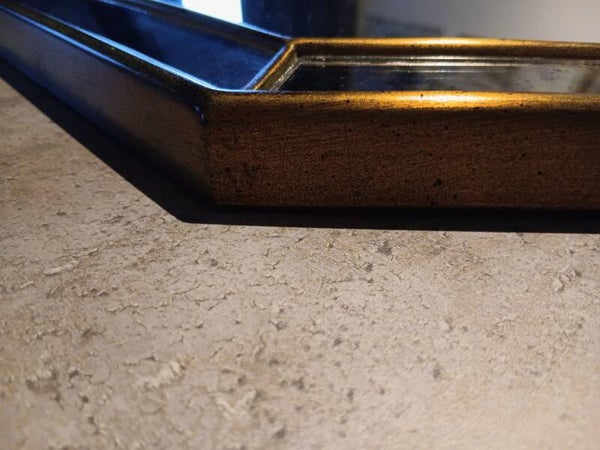 The wooden frame contributes extra weight compared to frameless mirrors, while the faceted mirrored edges increase the overall mass slightly due to the layered glass construction. Variations in weight are normal for vintage pieces, depending on the exact glass thickness and wood density used at the time of production.