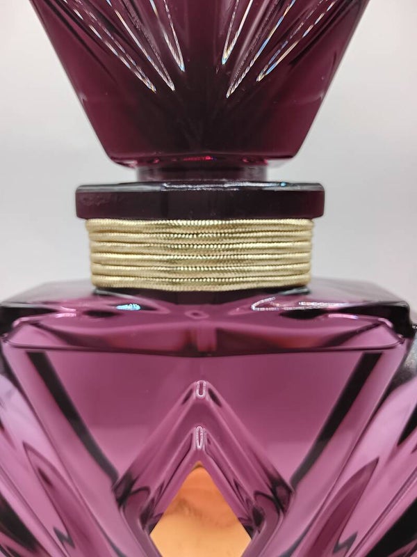 This specific example is in pristine, collector-grade condition. The heavy, deep amethyst-purple glass is flawlessly preserved, maintaining its rich color and Art Deco-inspired structural lines. Unlike many vintage displays, this bottle remains completely full with its original display fluid, offering the exact visual weight and presence intended by the designers.