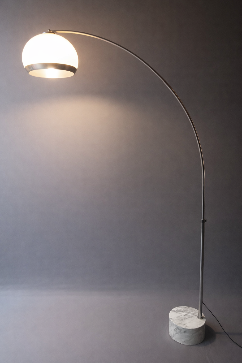 Original Italian arc floor lamp by Harvey Guzzini, featuring a solid white marble base, polished chrome stem, and large opaline glass dome shade. A strong 1970s design with architectural presence and balanced proportions.