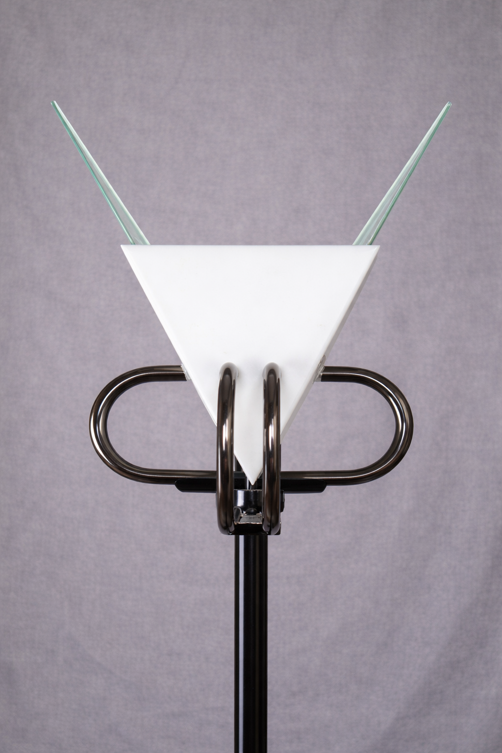 An original Triana floor lamp by Arteluce, produced in Italy during the 1980s. This model reflects the bold architectural language of Italian postmodern design. The construction combines a black lacquered steel structure with chromed metal details and interchangeable glass panels.
