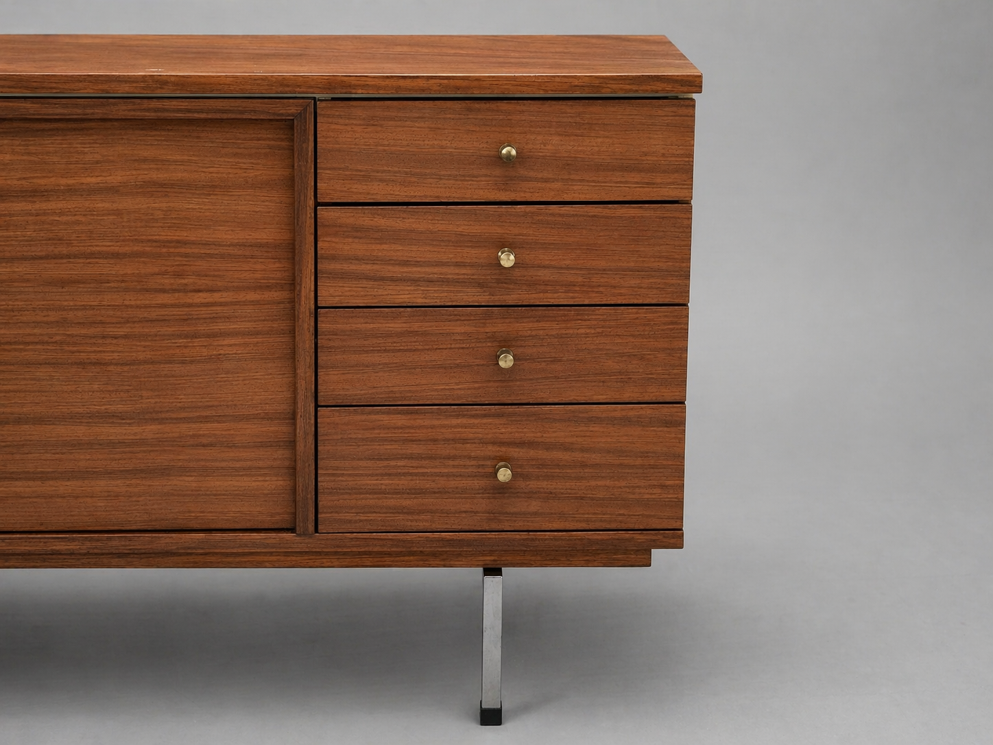 The layout is both practical and elegant, featuring sliding doors that open to generous storage space, alongside a drawer unit with four drawers for organized storage. The slender chrome legs elevate the cabinet, giving it a light, modern appearance, while subtle brass accents add a refined detail.