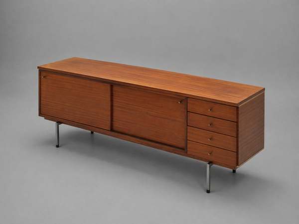 Executed in warm-toned teak veneer with a beautiful linear grain pattern, the sideboard features two sliding doors, four drawers, slender chrome legs, and subtle minimalist metal handles. The long horizontal silhouette and clean structure create a timeless presence that fits effortlessly in both mid-century and contemporary interiors.