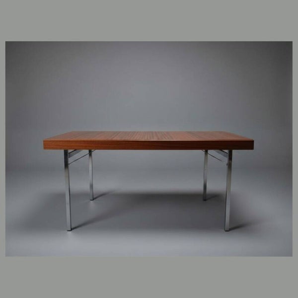 Elegant extendable dining table designed by Pieter De Bruyne for AL Meubel / V-Form, Belgium, circa 1960s. Featuring warm teak veneer, slender chrome legs, and a refined integrated butterfly extension system, this table combines architectural simplicity with highly functional design. A strong example of early Belgian modernism, perfectly matching the large Model 167/6 credenza and ideal for collectors of important mid-century furniture.