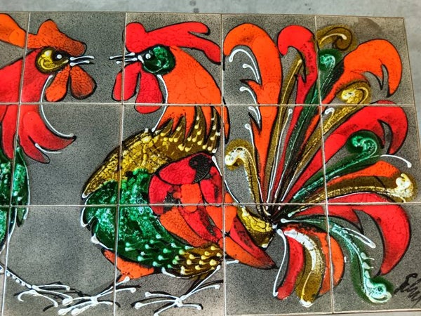 A striking vintage ceramic tile coffee table attributed to Juliette Belarti, crafted in Belgium during the 1960s. This eye-catching mid-century piece features a beautifully hand-glazed rooster motif in vibrant shades of red, orange, green, gold and black, creating a bold decorative statement with strong artistic character.