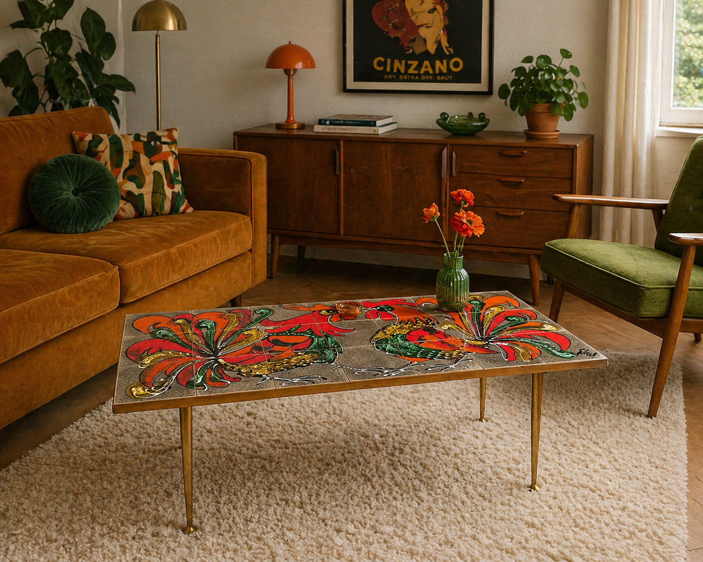 Striking vintage ceramic tile coffee table attributed to Juliette Belarti, made in Belgium during the 1960s. Featuring a vibrant hand-glazed rooster motif in rich red, orange, green and gold tones, set on elegant brass-tone metal legs. A bold mid-century statement piece with strong decorative character, ideal for eclectic, vintage or modern interiors. Signed on the top corner and full of authentic Belgian design charm.
