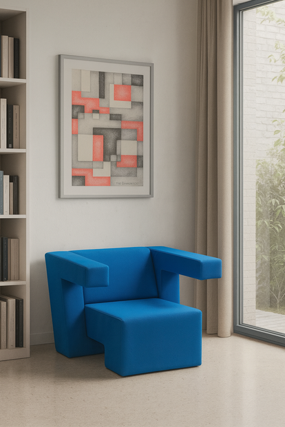 A striking Dutch-designed armchair by Studio Lawrence, featuring bold architectural lines and a sculptural, enveloping shape. Upholstered in vibrant cobalt blue, this postmodern piece is both functional and iconic. A true statement piece for any contemporary interior.